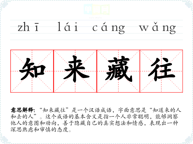 “知来藏往”是一个汉语成语,字面意思是“知道来的人和去的人”。这个成语的基本含义是指一个人非常聪明,能够洞察他人的意图和动向,善于隐藏自己的真实想法和情感,表现出一种深思熟虑和审慎的态度。