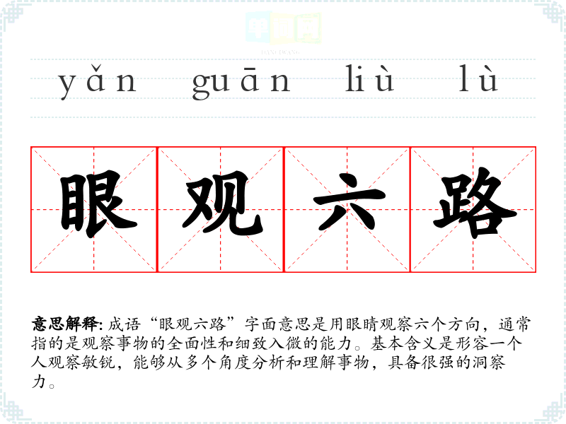 成语“眼观六路”字面意思是用眼睛观察六个方向,通常指的是观察事物的全面性和细致入微的能力。基本含义是形容一个人观察敏锐,能够从多个角度分析和理解事物,具备很强的洞察力。