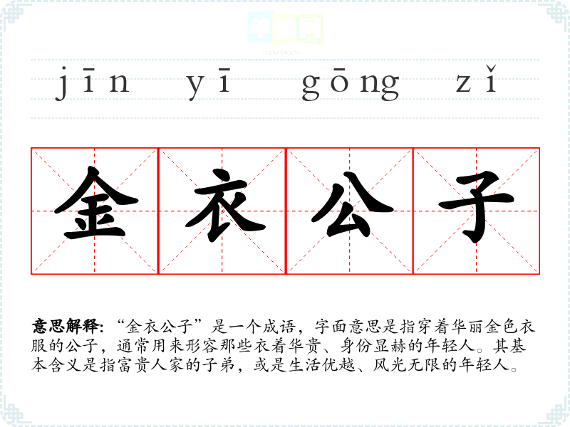 “金衣公子”是一个成语,字面意思是指穿着华丽金色衣服的公子,通常用来形容那些衣着华贵、身份显赫的年轻人。其基本含义是指富贵人家的子弟,或是生活优越、风光无限的年轻人。
