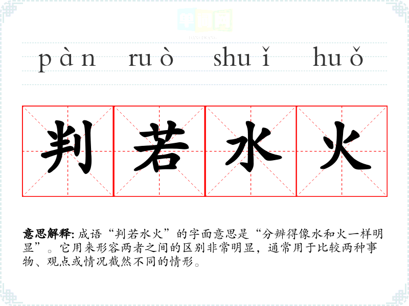 成语“判若水火”的字面意思是“分辨得像水和火一样明显”。它用来形容两者之间的区别非常明显,通常用于比较两种事物、观点或情况截然不同的情形。