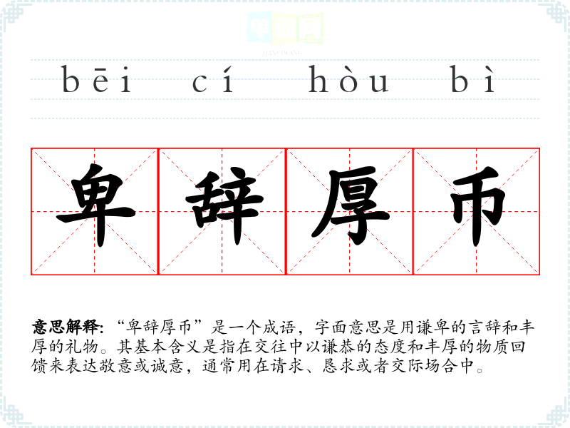“卑辞厚币”是一个成语,字面意思是用谦卑的言辞和丰厚的礼物。其基本含义是指在交往中以谦恭的态度和丰厚的物质回馈来表达敬意或诚意,通常用在请求、恳求或者交际场合中。