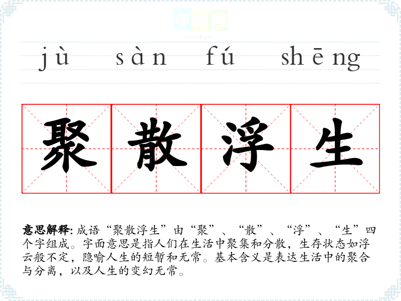 “聚散浮生”常被理解为反映人生哲学的成语,尤其在古代文人墨客的诗词中,关于人生无常的表达屡见不鲜。虽然具体出处并不明确,但类似的意象在唐诗、宋词中有很多体现,如李白、杜甫等诗人的作品中,常常探讨人生的聚散与漂泊。