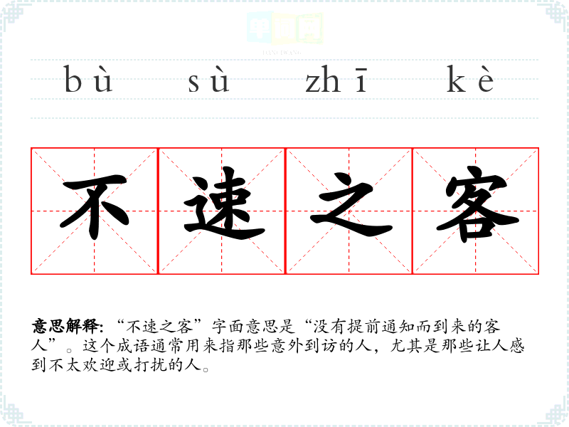 “不速之客”字面意思是“没有提前通知而到来的客人”。这个成语通常用来指那些意外到访的人,尤其是那些让人感到不太欢迎或打扰的人。