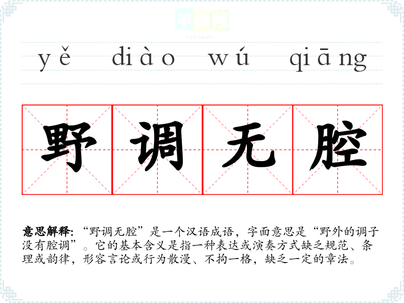 “野调无腔”是一个汉语成语,字面意思是“野外的调子没有腔调”。它的基本含义是指一种表达或演奏方式缺乏规范、条理或韵律,形容言论或行为散漫、不拘一格,缺乏一定的章法。