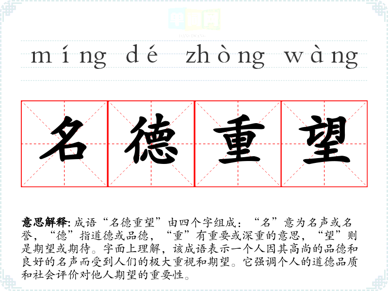 成语“名德重望”由四个字组成:“名”意为名声或名誉,“德”指道德或品德,“重”有重要或深重的意思,“望”则是期望或期待。字面上理解,该成语表示一个人因其高尚的品德和良好的名声而受到人们的极大重视和期望。它强调个人的道德品质和社会评价对他人期望的重要性。