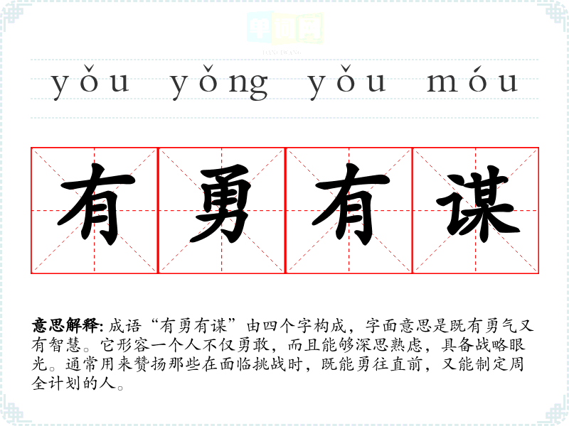 成语“有勇有谋”由四个字构成,字面意思是既有勇气又有智慧。它形容一个人不仅勇敢,而且能够深思熟虑,具备战略眼光。通常用来赞扬那些在面临挑战时,既能勇往直前,又能制定周全计划的人。