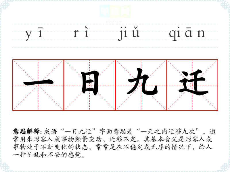 成语“一日九迁”字面意思是“一天之内迁移九次”,通常用来形容人或事物频繁变动、迁移不定。其基本含义是形容人或事物处于不断变化的状态,常常是在不稳定或无序的情况下,给人一种忙乱和不安的感觉。