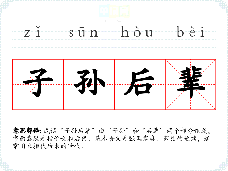成语“子孙后辈”由“子孙”和“后辈”两个部分组成。字面意思是指子女和后代,基本含义是强调家庭、家族的延续,通常用来指代后来的世代。