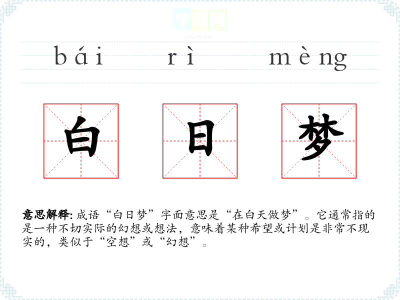 成语“白日梦”字面意思是“在白天做梦”。它通常指的是一种不切实际的幻想或想法,意味着某种希望或计划是非常不现实的,类似于“空想”或“幻想”。
