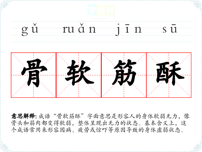 成语“骨软筋酥”字面意思是形容人的身体软弱无力,像骨头和筋肉都变得软弱,整体呈现出无力的状态。基本含义上,这个成语常用来形容因病、疲劳或惊吓等原因导致的身体虚弱状态。