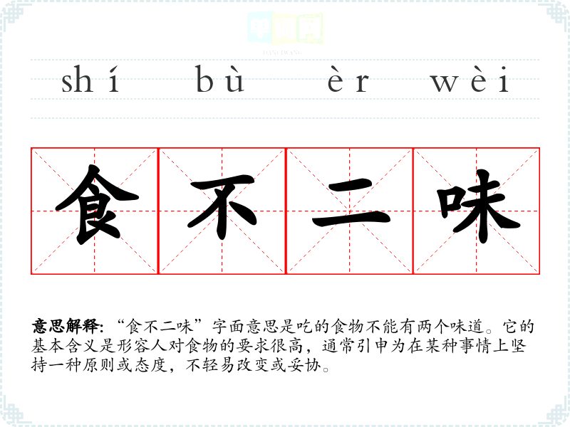 “食不二味”字面意思是吃的食物不能有两个味道。它的基本含义是形容人对食物的要求很高,通常引申为在某种事情上坚持一种原则或态度,不轻易改变或妥协。