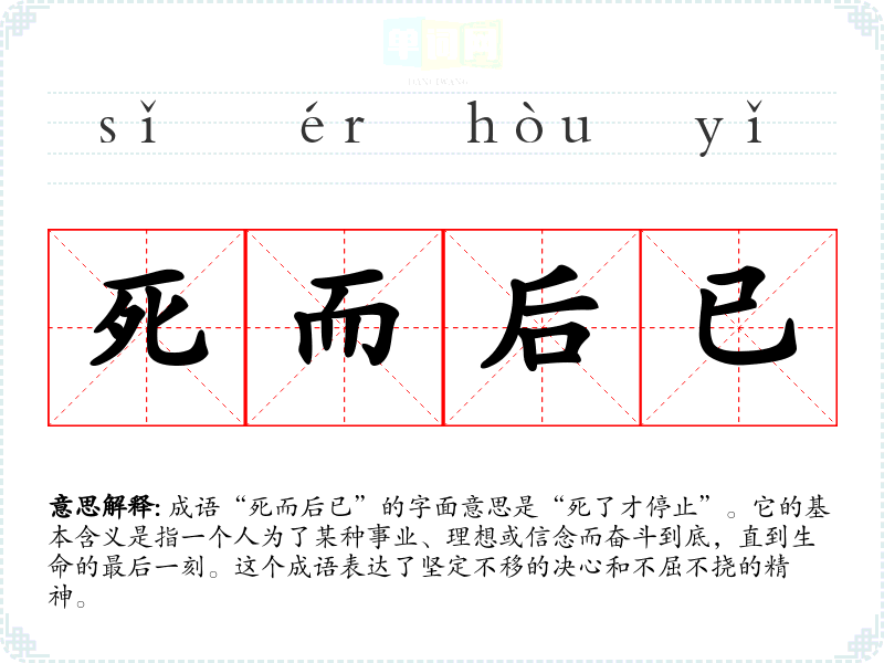 成语“死而后已”的字面意思是“死了才停止”。它的基本含义是指一个人为了某种事业、理想或信念而奋斗到底,直到生命的最后一刻。这个成语表达了坚定不移的决心和不屈不挠的精神。