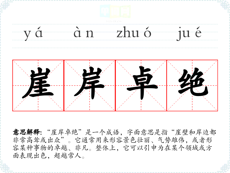 “崖岸卓绝”是一个成语,字面意思是指“崖壁和岸边都非常高耸或出众”。它通常用来形容景色壮丽、气势雄伟,或者形容某种事物的卓越、非凡。整体上,它可以引申为在某个领域或方面表现出色,超越常人。