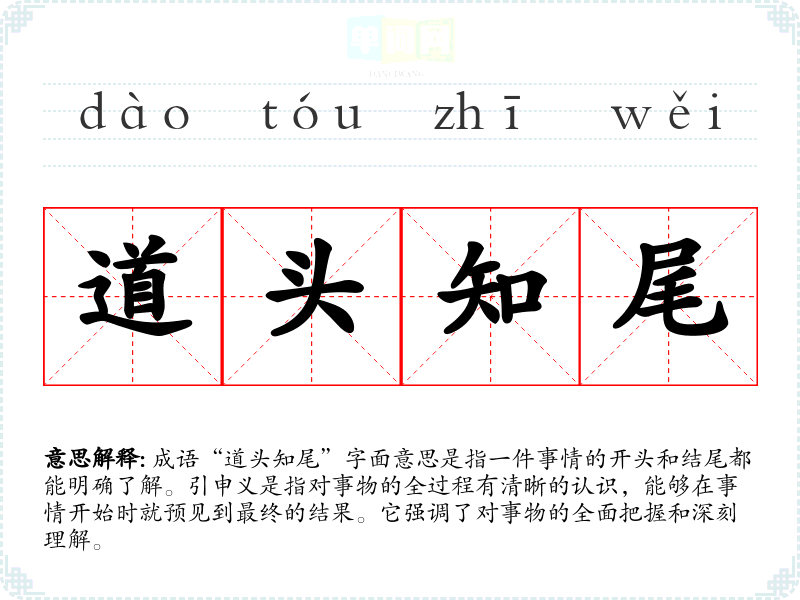 “道头知尾”源自古代的哲学思想,特别是道家和儒家思想中对事物因果关系的理解。虽然没有明确的文献出处,但可以推测其思想根基与《道德经》中对自然法则的理解相契合,强调事物发展的规律。