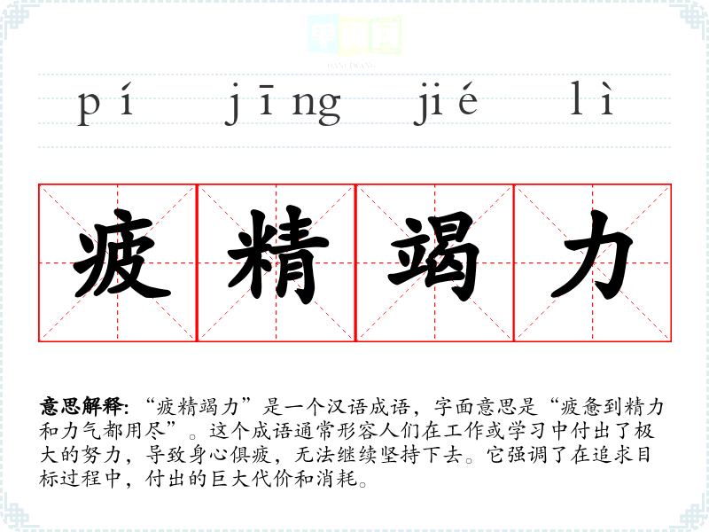 “疲精竭力”是一个汉语成语,字面意思是“疲惫到精力和力气都用尽”。这个成语通常形容人们在工作或学*中付出了极大的努力,导致身心俱疲,无法继续坚持下去。它强调了在追求目标过程中,付出的巨大代价和消耗。