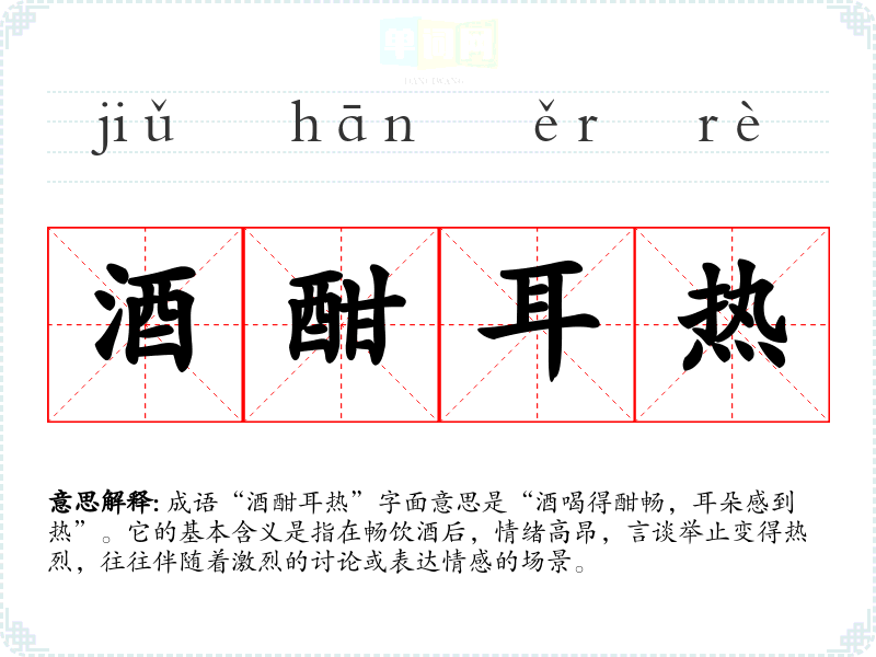 成语“酒酣耳热”字面意思是“酒喝得酣畅,耳朵感到热”。它的基本含义是指在畅饮酒后,情绪高昂,言谈举止变得热烈,往往伴随着激烈的讨论或表达情感的场景。