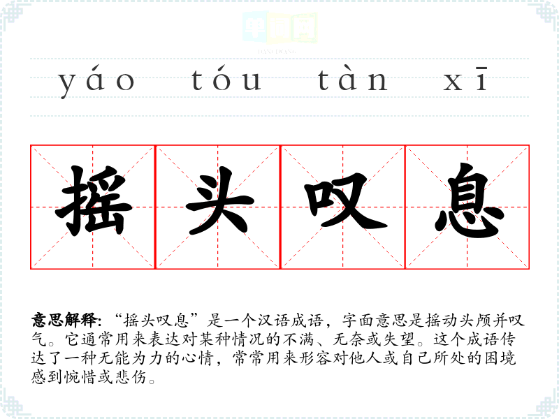 “摇头叹息”让我想到一种悲伤和无奈的情绪,常常与失落、悔恨相联系。它提醒我在生活中要面对现实,有时无法改变的事情就要接受,而不是过于纠结。