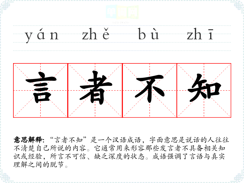“言者不知”是一个汉语成语,字面意思是说话的人往往不清楚自己所说的内容。它通常用来形容那些发言者不具备相关知识或经验,所言不可信、缺乏深度的状态。成语强调了言语与真实理解之间的脱节。