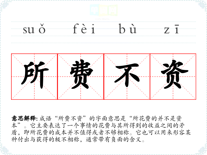 成语“所费不资”的字面意思是“所花费的并不是资本”。它主要表达了一个事情的花费与其所得到的收益之间的矛盾,即所花费的成本并不值得或者不够相称。它也可以用来形容某种付出与获得的极不相称,通常带有负面的含义。