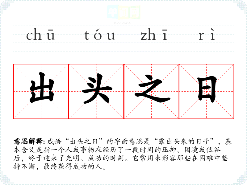 成语“出头之日”的字面意思是“露出头来的日子”,基本含义是指一个人或事物在经历了一段时间的压抑、困境或低谷后,终于迎来了光明、成功的时刻。它常用来形容那些在困难中坚持不懈,最终获得成功的人。