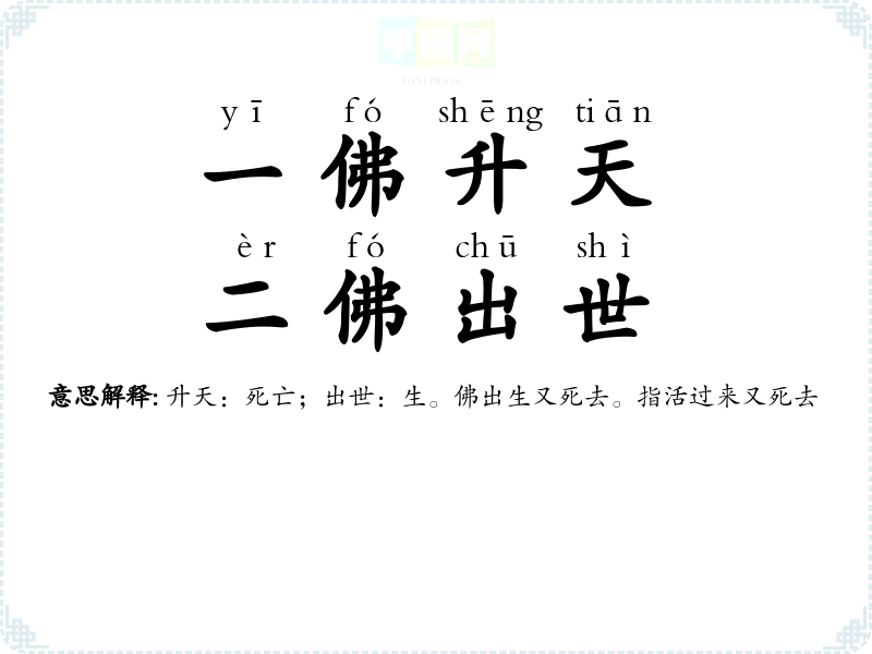 | 一佛升天,二佛出世 | 升天:死亡;出世:生。佛出生又死去。指活过来又死去 |