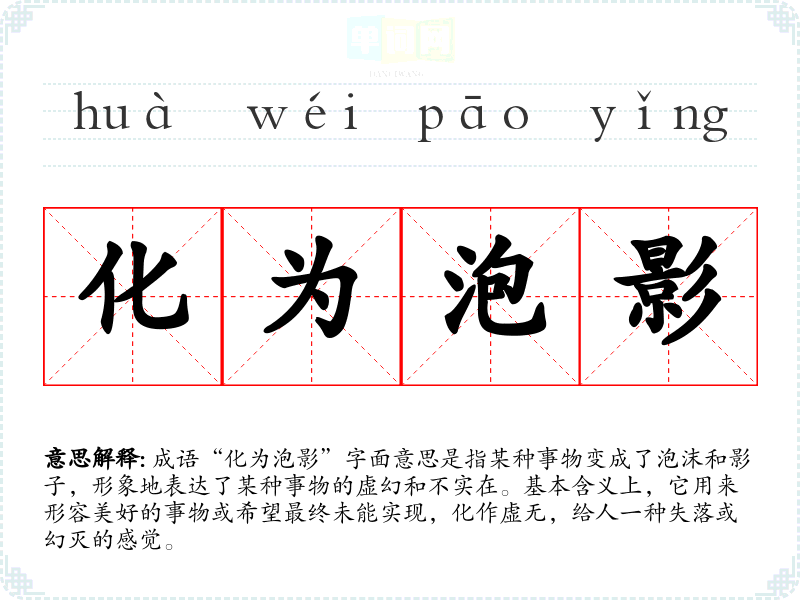 “化为泡影”的成语来源并没有明确的历史典故,但其构成的元素“泡影”在古代文学中常用来指代虚幻的事物。泡影是一种短暂而不真实的现象,象征着脆弱和易逝,反映了人的愿望和理想常常难以实现的现实。
