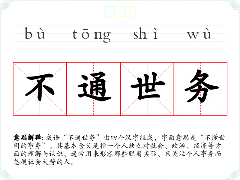 成语“不通世务”由四个汉字组成,字面意思是“不懂世间的事务”。其基本含义是指一个人缺乏对社会、政治、经济等方面的理解与认识,通常用来形容那些脱离实际、只关注个人事务而忽视社会大势的人。