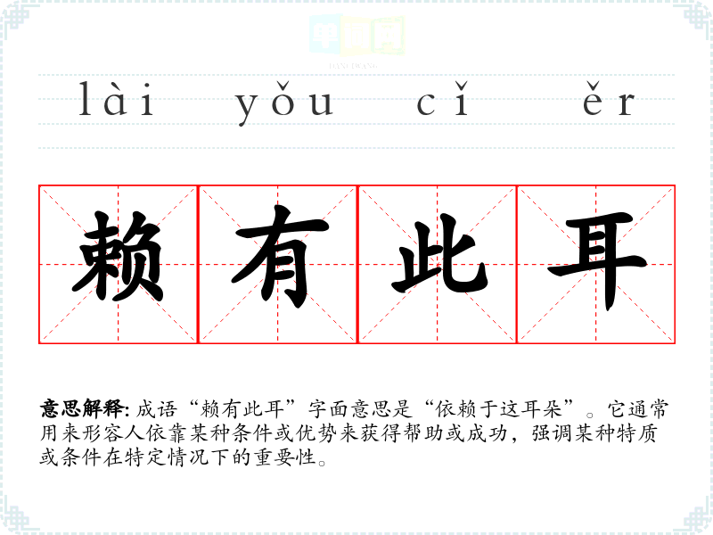 成语“赖有此耳”字面意思是“依赖于这耳朵”。它通常用来形容人依靠某种条件或优势来获得帮助或成功,强调某种特质或条件在特定情况下的重要性。