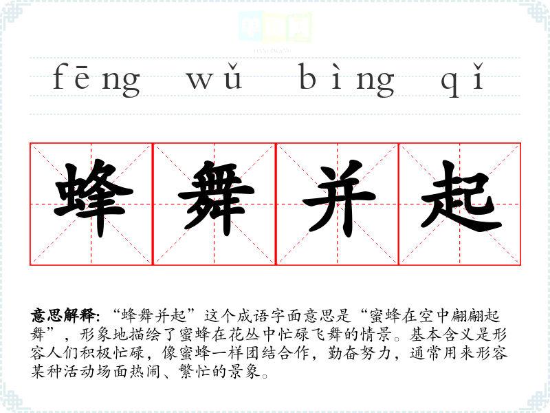 “蜂舞并起”这个成语字面意思是“蜜蜂在空中翩翩起舞”,形象地描绘了蜜蜂在花丛中忙碌飞舞的情景。基本含义是形容人们积极忙碌,像蜜蜂一样团结合作,勤奋努力,通常用来形容某种活动场面热闹、繁忙的景象。
