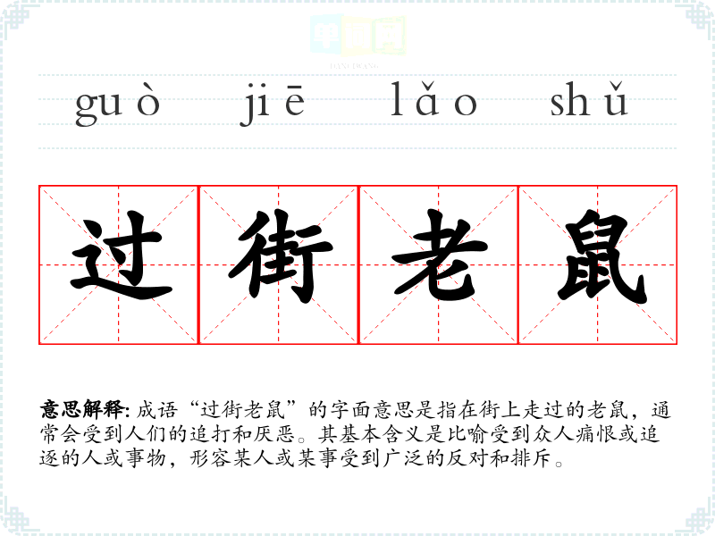 成语“过街老鼠”的字面意思是指在街上走过的老鼠,通常会受到人们的追打和厌恶。其基本含义是比喻受到众人痛恨或追逐的人或事物,形容某人或某事受到广泛的反对和排斥。