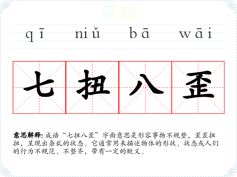 成语“七扭八歪”字面意思是形容事物不规整,歪歪扭扭,呈现出杂乱的状态。它通常用来描述物体的形状、状态或人们的行为不规范、不整齐,带有一定的贬义。