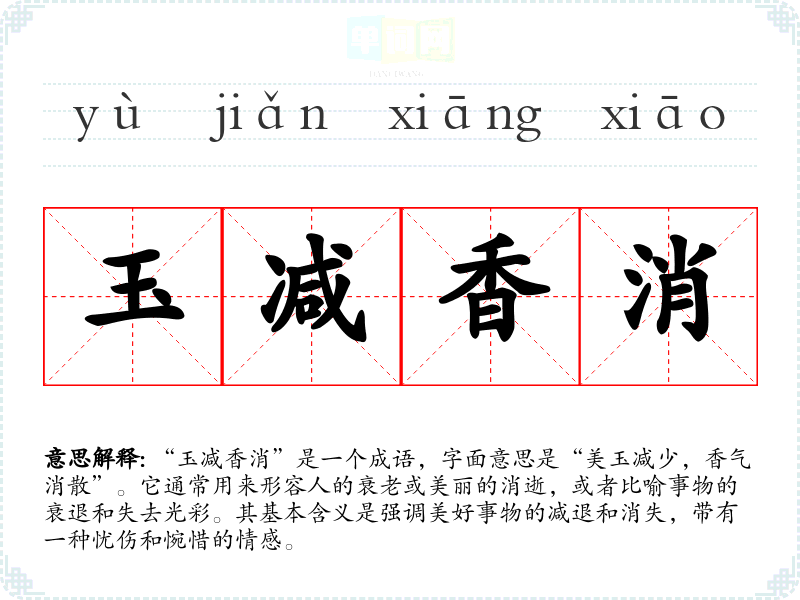 “玉减香消”是一个成语,字面意思是“美玉减少,香气消散”。它通常用来形容人的衰老或美丽的消逝,或者比喻事物的衰退和失去光彩。其基本含义是强调美好事物的减退和消失,带有一种忧伤和惋惜的情感。