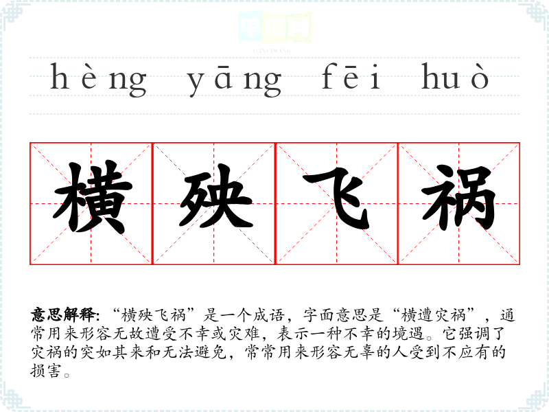 | 横殃飞祸 | 横:意外的。指意外的、平白无故的灾祸。 |