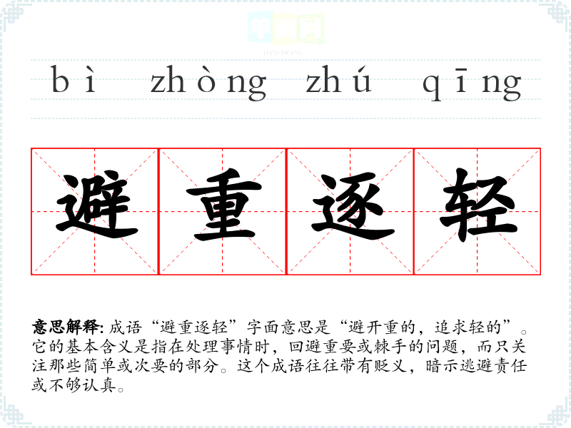 成语“避重逐轻”字面意思是“避开重的,追求轻的”。它的基本含义是指在处理事情时,回避重要或棘手的问题,而只关注那些简单或次要的部分。这个成语往往带有贬义,暗示逃避责任或不够认真。