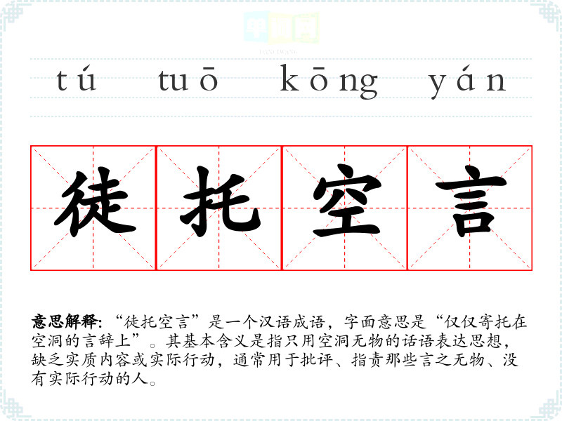 “徒托空言”是一个汉语成语,字面意思是“仅仅寄托在空洞的言辞上”。其基本含义是指只用空洞无物的话语表达思想,缺乏实质内容或实际行动,通常用于批评、指责那些言之无物、没有实际行动的人。