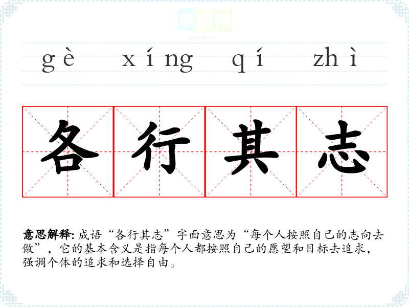成语“各行其志”字面意思为“每个人按照自己的志向去做”,它的基本含义是指每个人都按照自己的愿望和目标去追求,强调个体的追求和选择自由。