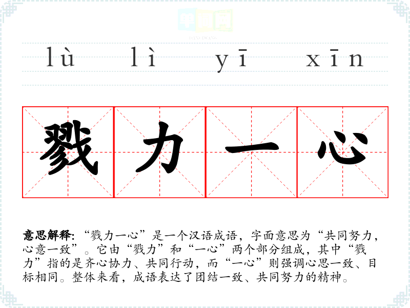 “戮力一心”是一个汉语成语,字面意思为“共同努力,心意一致”。它由“戮力”和“一心”两个部分组成,其中“戮力”指的是齐心协力、共同行动,而“一心”则强调心思一致、目标相同。整体来看,成语表达了团结一致、共同努力的精神。
