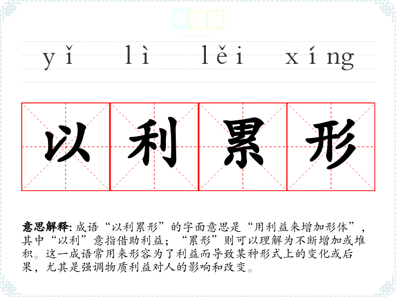 “以利累形”并没有明确的历史典故或经典文学出处,然而,从其字面构成和语义来看,它反映了**传统文化中对利益与道德、形象之间关系的关注。在古代文人对社会现象的观察中,常会提到人们为了追求利益而改变自身形象或行为的现象。