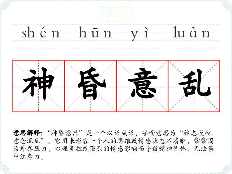 “神昏意乱”是一个汉语成语,字面意思为“神志模糊,意念混乱”。它用来形容一个人的思维或情感状态不清晰,常常因为外界压力、心理负担或强烈的情感影响而导致精神恍惚、无法集中注意力。