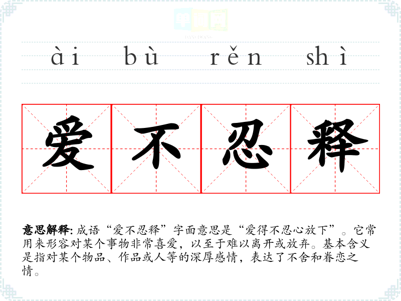 成语“爱不忍释”字面意思是“爱得不忍心放下”。它常用来形容对某个事物非常喜爱,以至于难以离开或放弃。基本含义是指对某个物品、作品或人等的深厚感情,表达了不舍和眷恋之情。