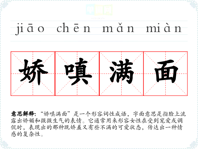 “娇嗔满面”是一个形容词性成语,字面意思是指脸上流露出娇媚和微微生气的表情。它通常用来形容女性在受到宠爱或调侃时,表现出的那种既娇羞又有些不满的可爱状态,传达出一种情感的复杂性。