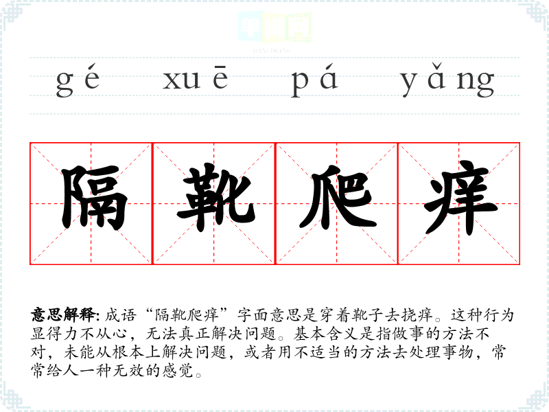 成语“隔靴爬痒”字面意思是穿着靴子去挠痒。这种行为显得力不从心,无法真正解决问题。基本含义是指做事的方法不对,未能从根本上解决问题,或者用不适当的方法去处理事物,常常给人一种无效的感觉。