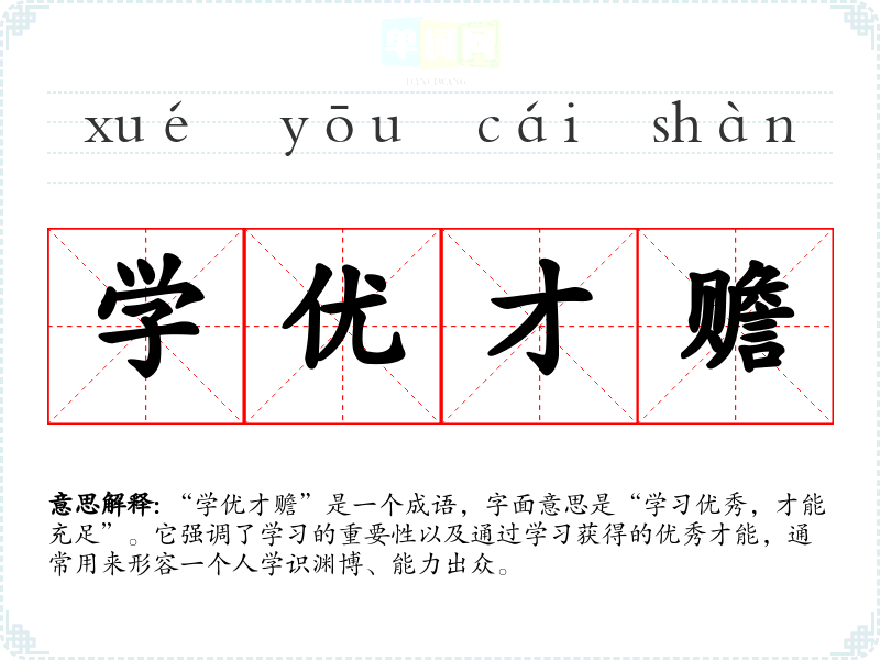 “学优才赡”是一个成语,字面意思是“学优秀,才能充足”。它强调了学的重要性以及通过学*获得的优秀才能,通常用来形容一个人学识渊博、能力出众。