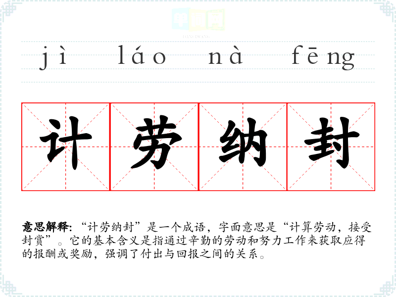 “计劳纳封”是一个成语,字面意思是“计算劳动,接受封赏”。它的基本含义是指通过辛勤的劳动和努力工作来获取应得的报酬或奖励,强调了付出与回报之间的关系。