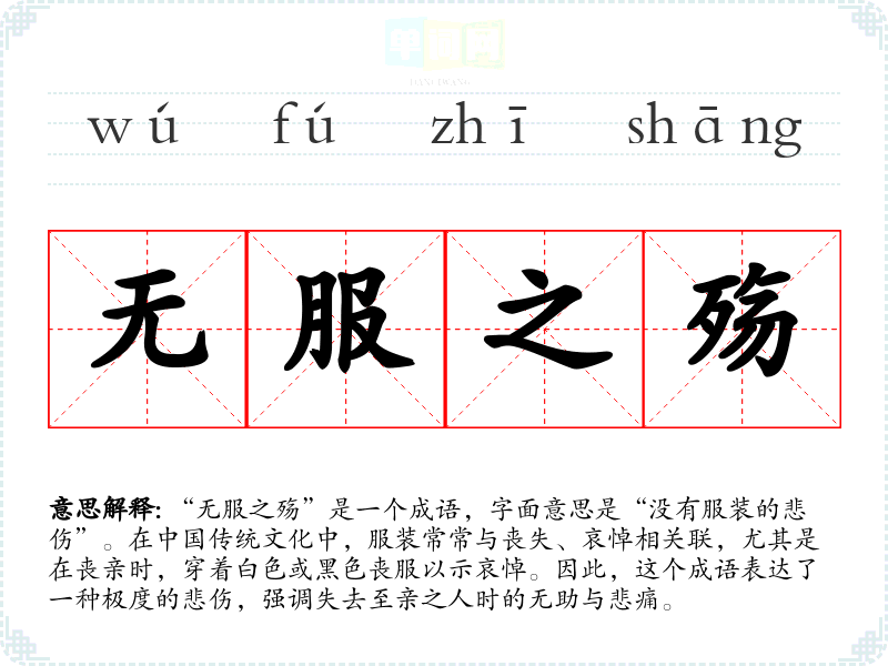 “无服之殇”是一个成语,字面意思是“没有服装的悲伤”。在**传统文化中,服装常常与丧失、哀悼相关联,尤其是在丧亲时,穿着白色或黑色丧服以示哀悼。因此,这个成语表达了一种极度的悲伤,强调失去至亲之人时的无助与悲痛。