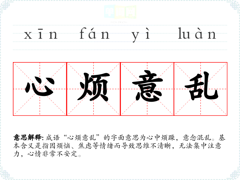 成语“心烦意乱”的字面意思为心中烦躁,意念混乱。基本含义是指因烦恼、焦虑等情绪而导致思维不清晰,无法集中注意力,心情非常不安定。