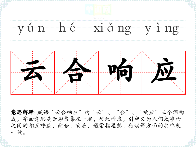 “云合响应”并没有明确的历史典故或文学出处,但其构成的字词在古文中多次出现,常用来描绘自然现象或人们的团结一致。例如,古代诗词中常以“云”象征人们的聚合与共鸣,体现一种和谐的氛围。