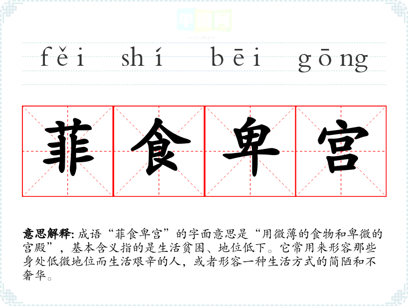 成语“菲食卑宫”的字面意思是“用微*的食物和卑微的宫殿”,基本含义指的是生活贫困、地位低下。它常用来形容那些身处低微地位而生活艰辛的人,或者形容一种生活方式的简陋和不奢华。