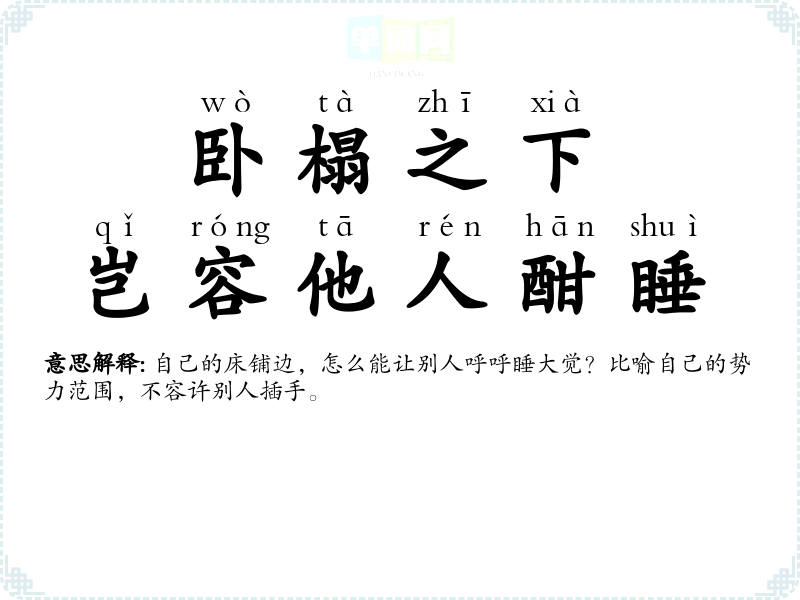 | 卧榻之下,岂容他人酣睡 | 自己的床铺边,怎么能让别人呼呼睡大觉?比喻自己的势力范围,不容许别人插手。 |