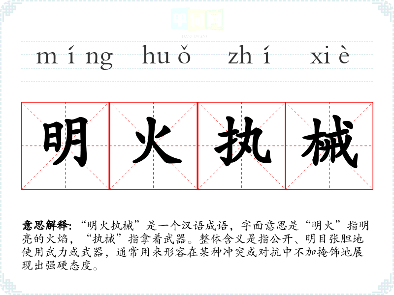 “明火执械”是一个汉语成语,字面意思是“明火”指明亮的火焰,“执械”指拿着武器。整体含义是指公开、明目张胆地使用武力或武器,通常用来形容在某种冲突或对抗中不加掩饰地展现出强硬态度。